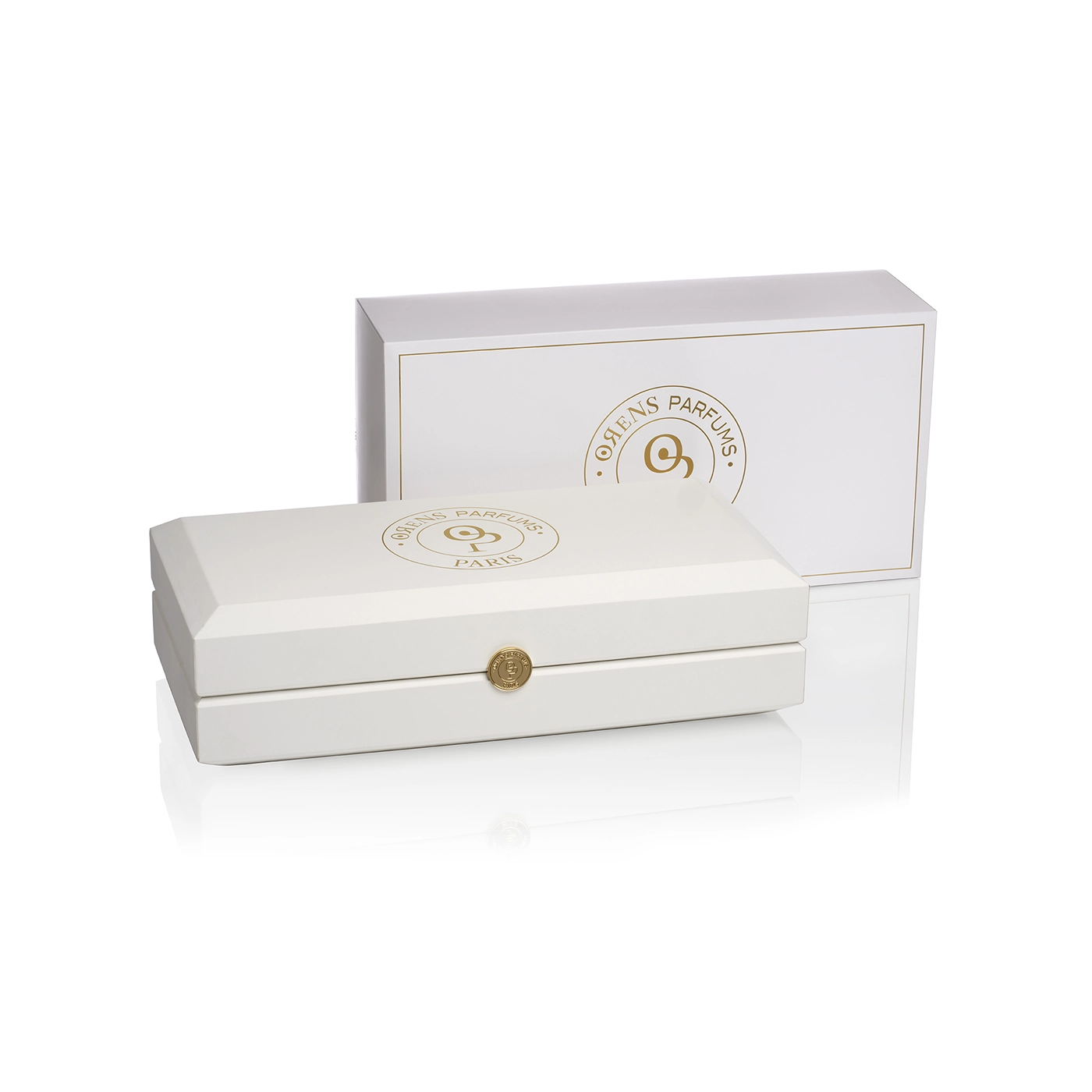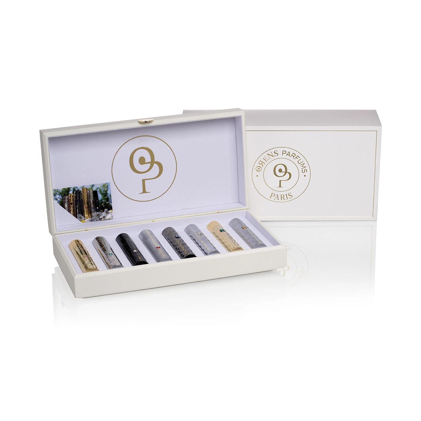 VIP Coffret containing 8 magnetic metal holders beautifully engraved and 8 fragrances of 50ml each: Callis Subtile, Moiré de Kalha, Silenda d’Ecume, Sabil Nocturne, Undéa des Iles, Serr d’Eden, Yama Rouge, Utaki Sacre.